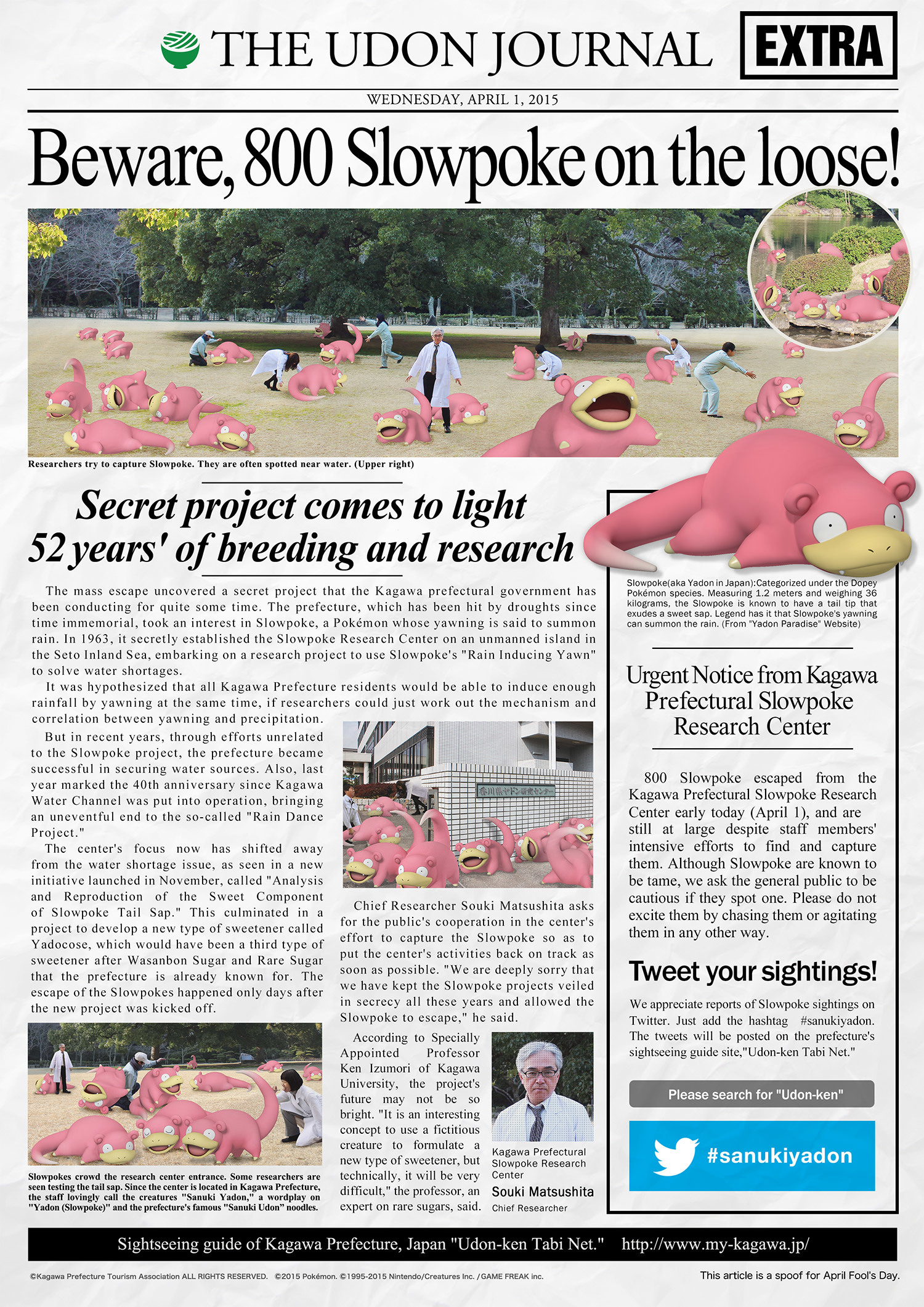 The idea first sparked with a play on words using the similarity between "udon" (a type of noodle) and "Yadon" (Slowpoke's Japanese name). The clever coincidence inspired a collaboration with Kagawa Prefecture and led to an April Fool's Day newspaper article with the headline, "Beware, 800 Slowpoke on the loose!".
